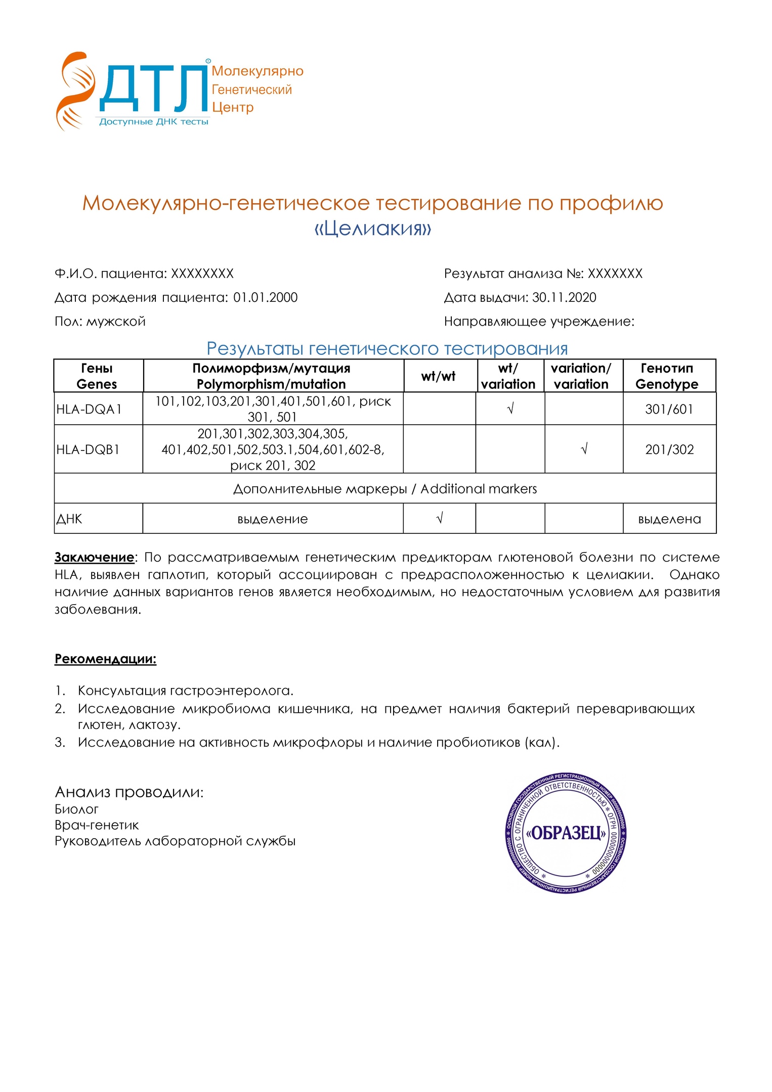 ДНК анализ на непереносимость глютена относится к группе персональных тестов на непереносимости. Он покажет генетическую предрасположенность к заболеванию целиакией. В результате вы получите точный ответ о наличии или отсутствии генов, отвечающих за развитие целиакии.