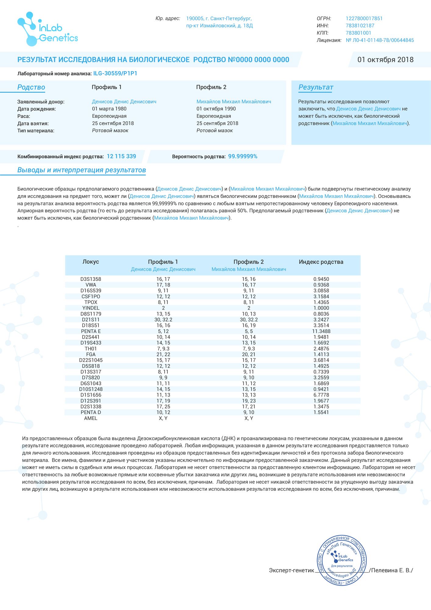Мы используем большое количество уникальных аутосомных маркеров, либо тест по Y-хромосоме, либо тест по мтДНК — в зависимости от каждого конкретного случая. ДНК анализ на установление родства между братьями и сестрами, бабушкой и внуками, дядей и племянниками и т.д. мы выполняем с высочайшей точностью до 99,99999%.